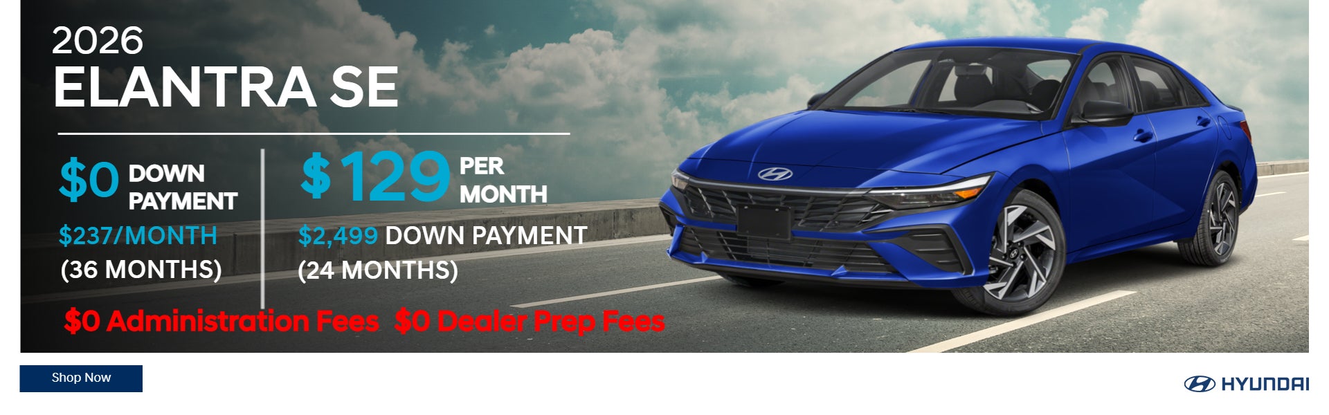 1st Payment, Tax, Tags, Acquisition, & DMV Fees due at signing *** Lease special based on 2026 Elantra SE model w/ MSRP of $24,595 – Limited availability, must be from dealer stock, offer valid while supplies last. $129 payment is based on 24 months / 7,500 miles per year and includes all applicable rebates and incentives. Subject to Hyundai Motor Finance Tier 1 creditapproval. Not applicable with other offers. Program ends 4/30/26***