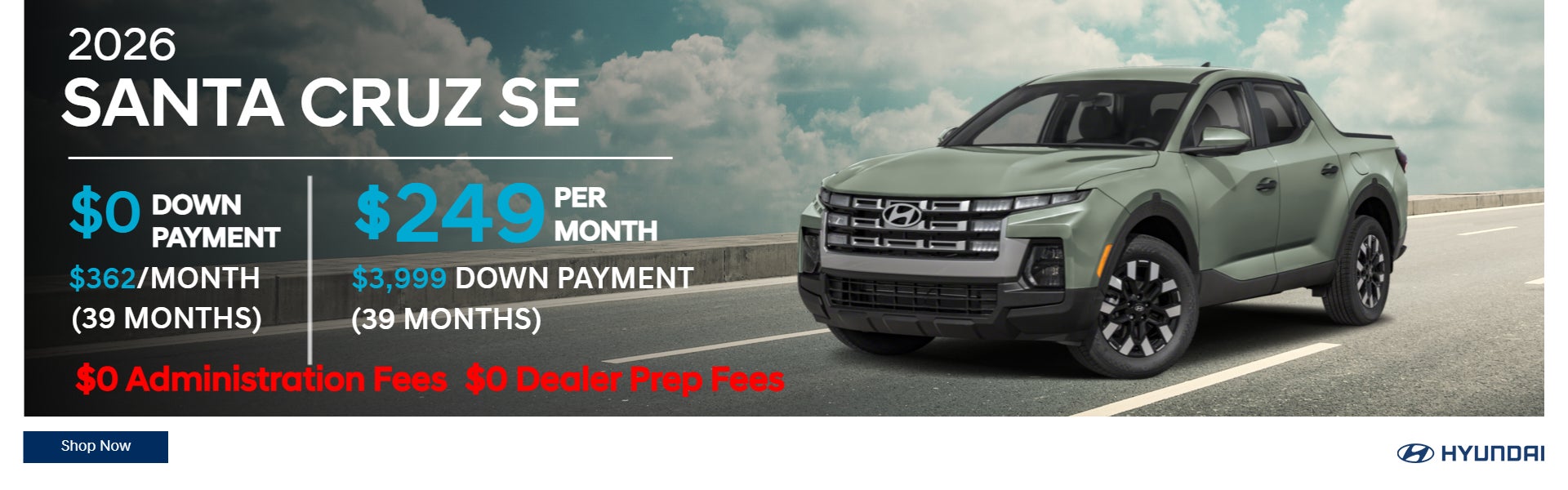 1st Payment, Tax, Tags, Acquisition, & DMV Fees due at signing *** Lease special based on 2026 Santa Cruz SE All Wheel Drive model w/ MSRP of $34,095 – Limited availability, must be from dealer stock, offer valid while supplies last. $249 payment is based on 39 months / 7,500 miles per year and includes all applicable rebates and incentives.. All Specials are Subject to HMF Tier 1 credit approval. Not applicable with other offers. Program ends 2/28/26***